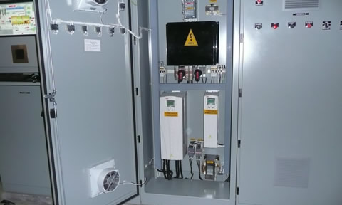 - Power Cabinet PU400 , contains a three phase mains switch, pump staters, motor protections and a power transformer. Space is left for accomodating up to 3 variable speed drives (one air blower and 2 pumps). It also contains several manual operation devices.